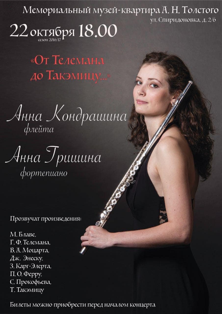 22 октября 2016 в Москве, в музее-квартире А. Н. Толстого, состоится концерт «От Телемана до Такэмицу».