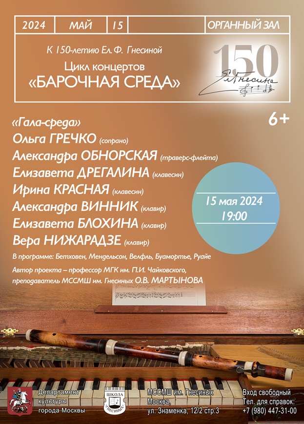15 мая 2024 в Органном зале МССМШ им. Гнесиных прозвучит «Гала-среда» – заключительный концерт третьего сезона бесплатных концертов барочной музыки.