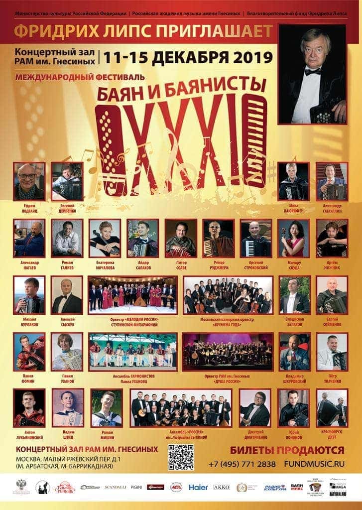 C 11 по 15 декабря 2019 года в Москве в Концертном зале Российской академии музыки им. Гнесиных состоится ежегодный Международный фестиваль «Баян и баянисты». Фестиваль проходит при поддержке Министерства культуры Российской Федерации, Российской академии музыки им. Гнесиных и Благотворительного фонда Фридриха Липса.