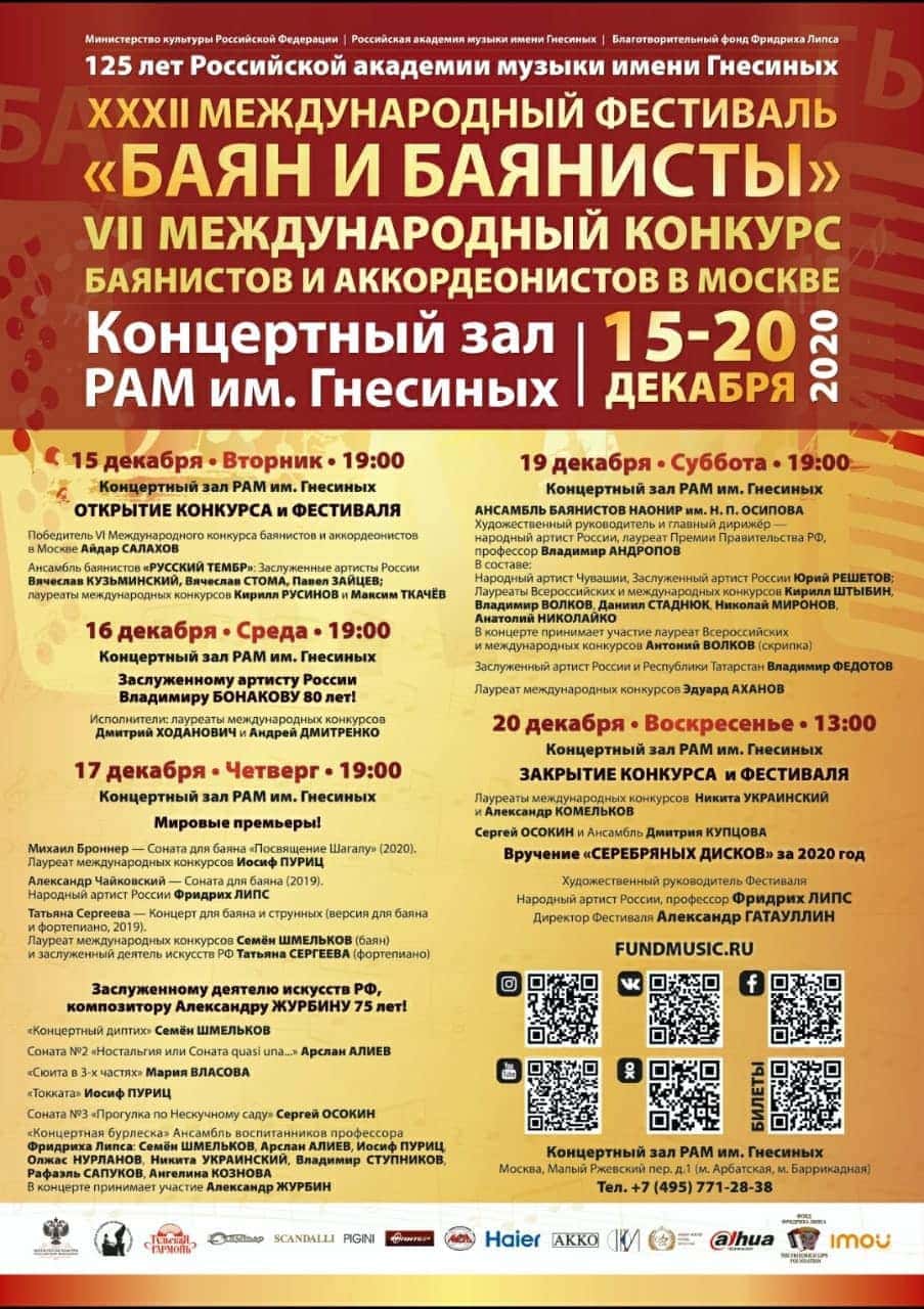 C 15 по 20 декабря 2020 года в Москве открывается ежегодный Международный фестиваль «Баян и баянисты».С 13 декабря по 20 декабря будет проходить VII Международный конкурс баянистов и аккордеонистов. Мероприятия фестиваля и конкурса достойно завершают 2020-й год, посвященный 125-летию Гнесинской системы музыкального образования.
