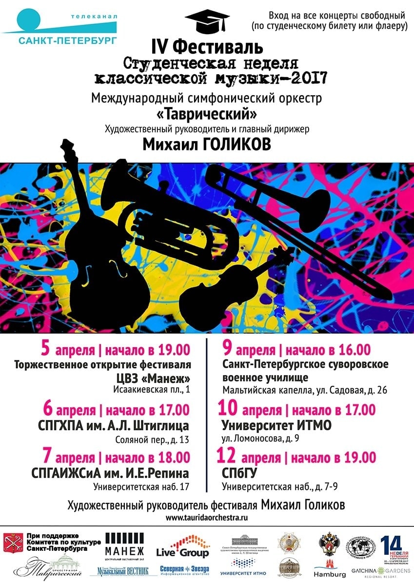 5 апреля 2017 года в Центральном выставочном зале «Манеж» (Иссакиевская пл., 1) состоится открытие IV Фестиваля «Студенческая неделя классической музыки», ежегодно организуемого Международным симфоническим оркестром «Таврический» при поддержке Комитета по культуре Санкт-Петербурга.