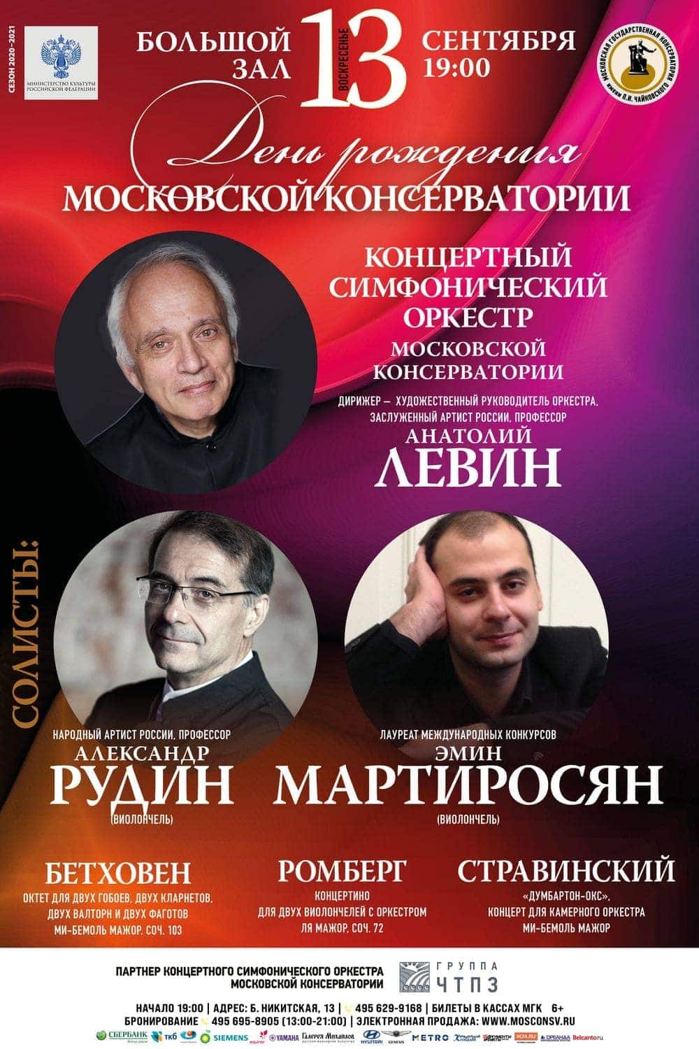 В программе ко дню рождения Московской консерватории принимают участие известные российские виолончелисты: народный артист России, профессор Александр Рудин и Эмин Мартиросян, лауреат международных конкурсов, солист Московского камерного оркестра Musica Viva.