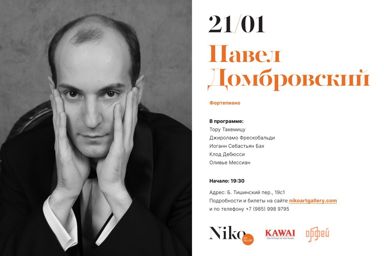 21 января 2025 пианист Павел Домбровский исполнит авторскую программу с произведениями Мессиана, Такемицу, Баха и Фрескобальди.