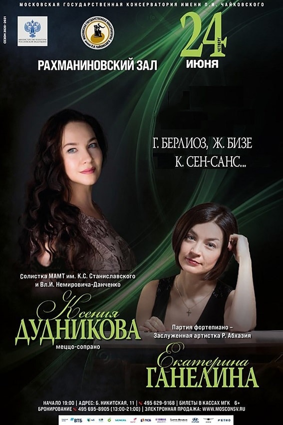 24 июня 2021 в Рахманиновском зале Московской консерватории состоится концерт Ксении Дудниковой (меццо-сопрано) и Екатерины Ганелиной (фортепиано).