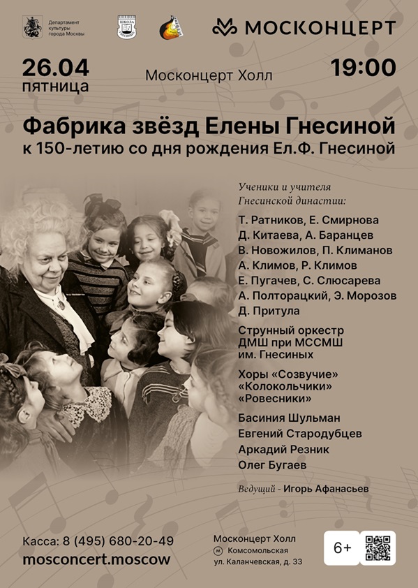26 апреля 2024 в Москонцерт Холле состоится праздничный концерт, посвященный 150-летию со дня рождения Елены Фабиановны Гнесиной — одной из основательниц гнесинских учебных заведений, великого педагога, внесшего большой вклад в создание отечественной системы непрерывного музыкального образования.