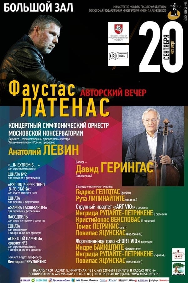 В программе концерта значатся камерные ансамбли и соната для виолончели и симфонического оркестра, соната для скрипки и фортепиано, пьеса для струнного оркестра. Сочинения Латенаса исполнят музыканты концертного симфонического оркестра Московской консерватории под управлением Анатолия Левина.