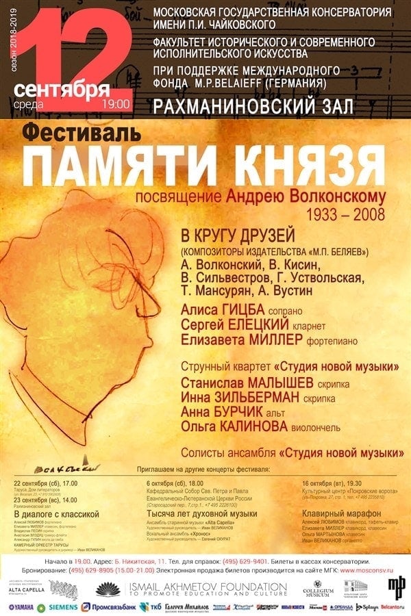 С 12 сентября по 16 октября 2018 в Москве и Тарусе состоятся концерты фестиваля «Памяти князя», посвященного композитору и клавесинисту, основателю ансамбля старинной музыки «Мадригал» Андрею Волконскому (1933-2008).