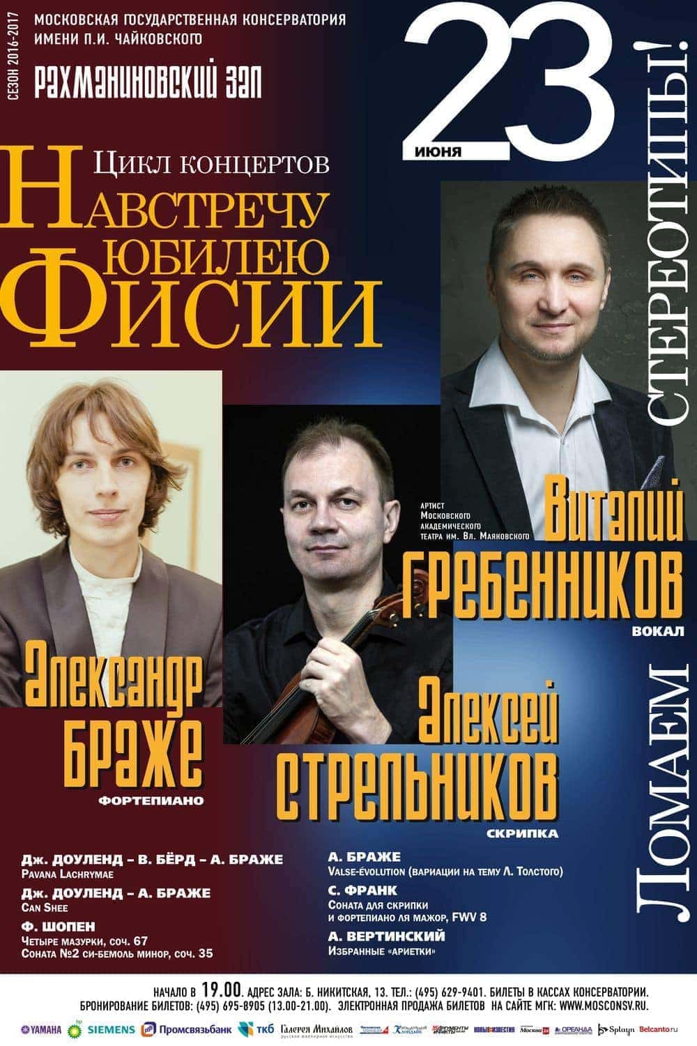 23 июня 2017 года — транскрипции и оригиналы сочинений Доуленда, Шопена, Франка, которые приготовили Александр Браже (фортепиано), Алексей Стрельников (скрипка), Виталий Гребенников (вокал).