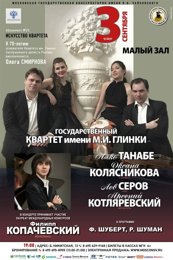 3 сентября 2020 в Малом зале Московской консерватории выступит Государственный квартет имени М. И. Глинки — Аяко Танабе, Оксана Колясникова, Лев Серов и Арсений Котляревский.