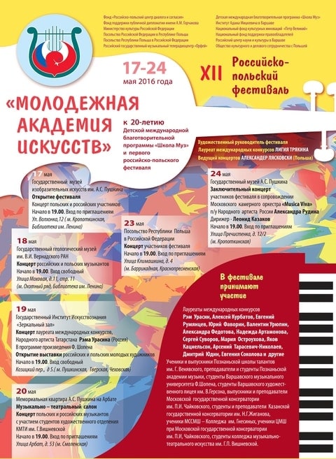 С 17 по 24 мая 2016 года в Москве состоится XII российско-польский фестиваль «Молодёжная академия Искусств», посвященный двадцатилетию первого российско-польского фестиваля и двадцатилетию создания Детской международной благотворительной программы «Школа муз».