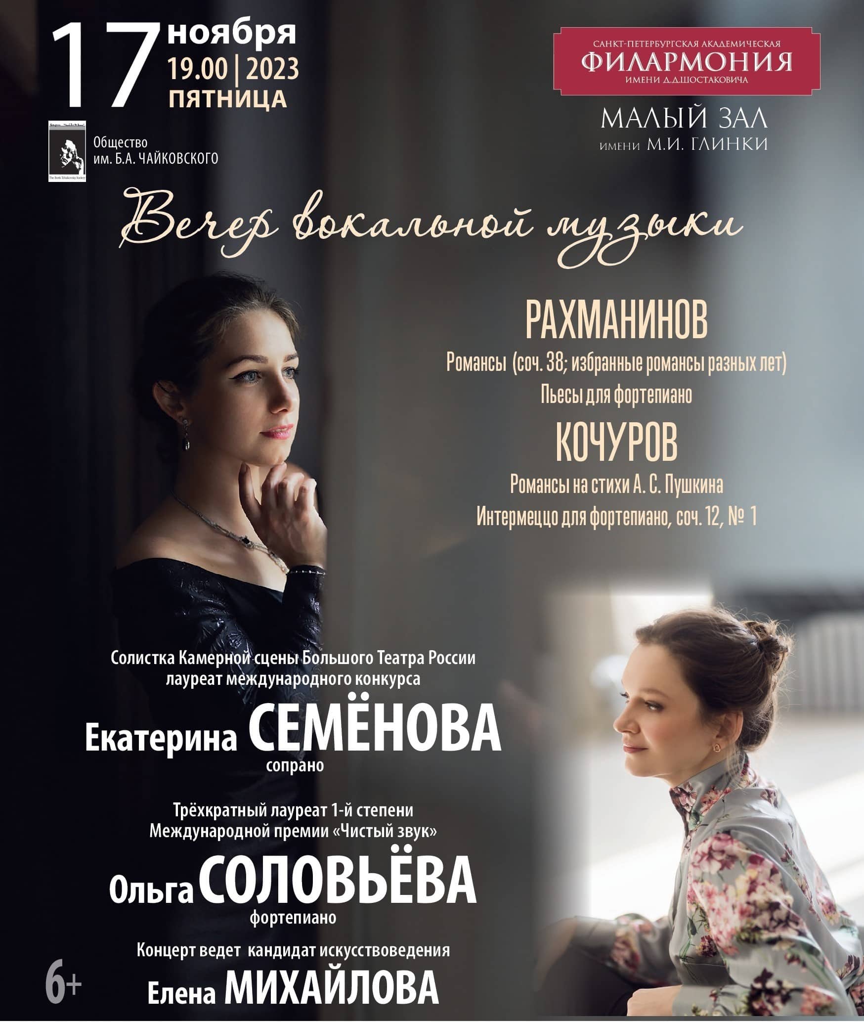 На сцене Малого зала Санкт-Петербургской филармонии выступят солистка Большого театра России Екатерина Семёнова (сопрано) и трёхкратный лауреат Премии «Чистый звук» Ольга Соловьёва (фортепиано).