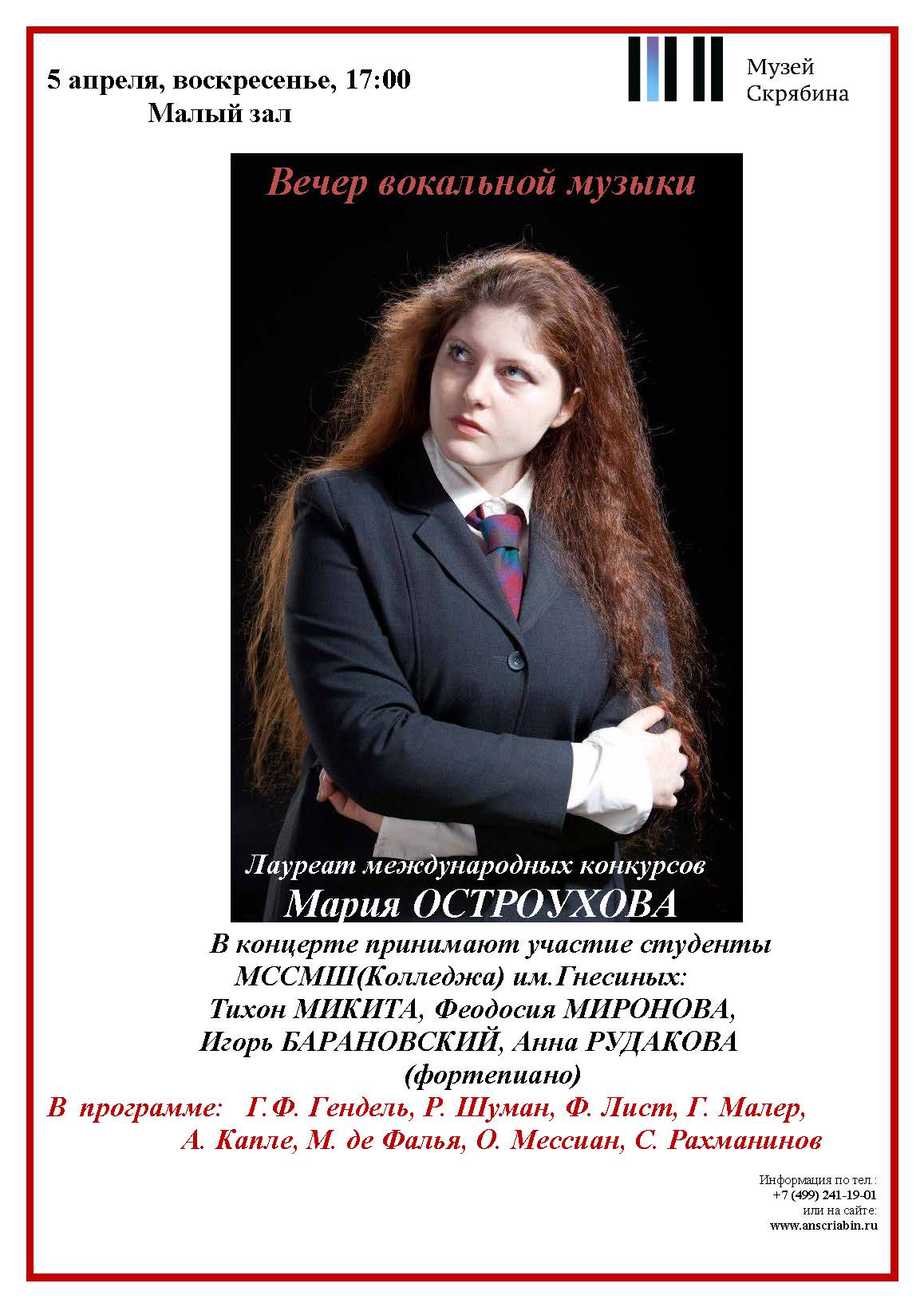 5 апреля в 17:00 в Малом зале музея Скрябина состоится вечер вокальной музыки.