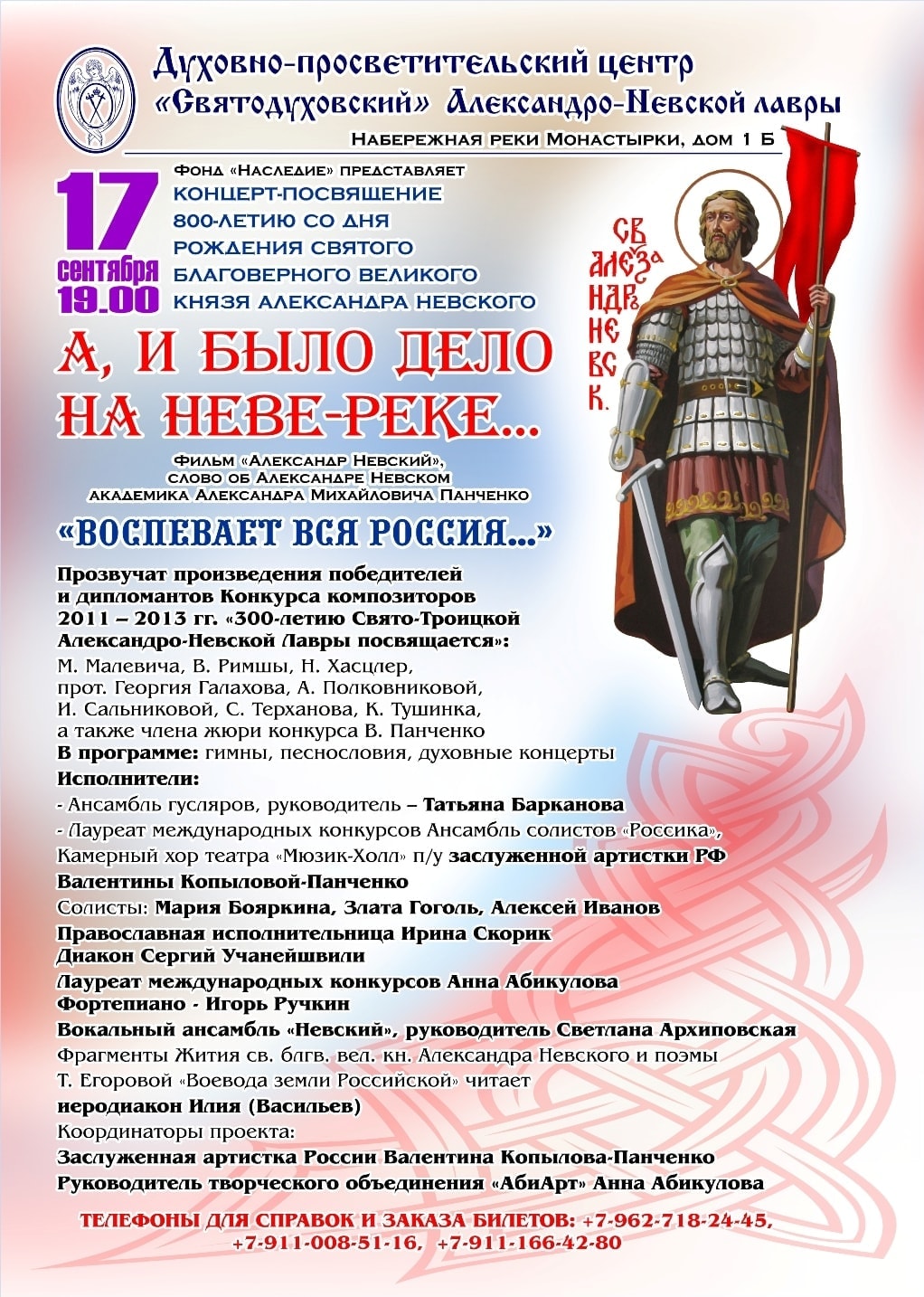 Прозвучат гимны, песнопения, стихиры, тропари и кондаки, прославляющие жизнь и деяния св. Александра Невского. Под перезвон колоколов будет исполнена стихира XVI века (время канонизации св. Александра Невского) в расшифровке известного петербургского ученого-медиевиста Натальи Серегиной. Под звуки гуслей прозвучат фрагменты «Жития Александра Невского» и поэмы петербургской поэтессы Татьяны Егоровой «Воевода Российской земли». Тексты жития и поэмы будут чередоваться с песнопениями и объединяться в единую композицию восхваления и прославления памяти Александра Невского.