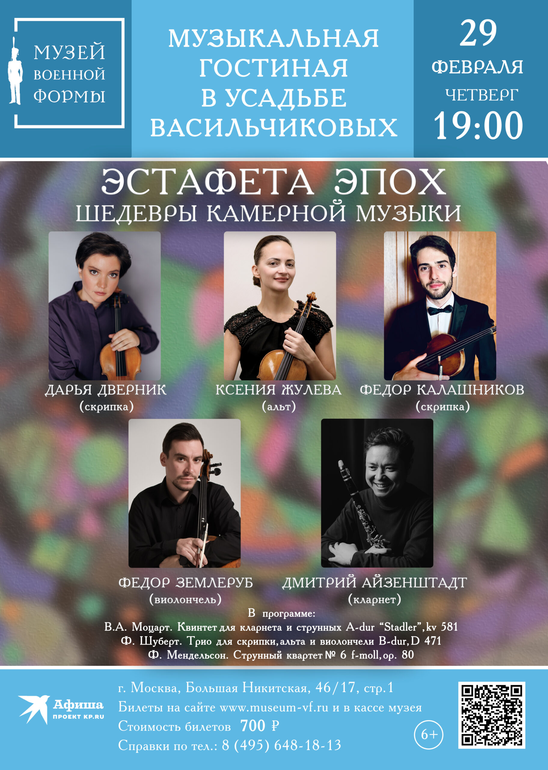 29 февраля 2024 года в 19:00 в Музыкальной гостиной усадьбы Васильчиковых на Большой Никитской прозвучат камерные сочинения В. А. Моцарта, Франца Шуберта и Феликса Мендельсона.