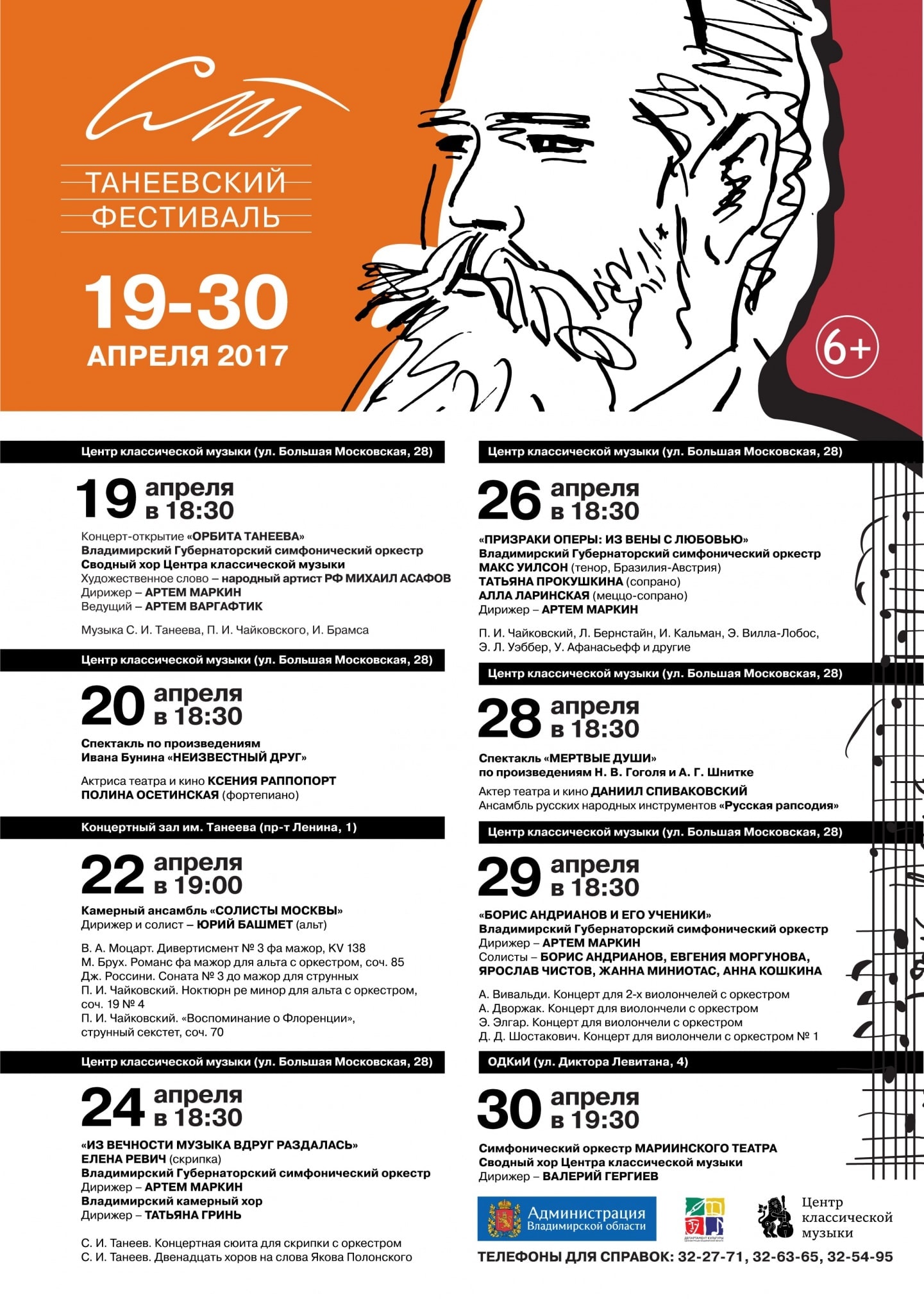 30 апреля 2017 во Владимире состоится концерт-закрытие II Танеевского фестиваля, посвященного памяти уроженца города, выдающегося композитора, ученого-музыковеда и преподавателя Сергея Танеева.