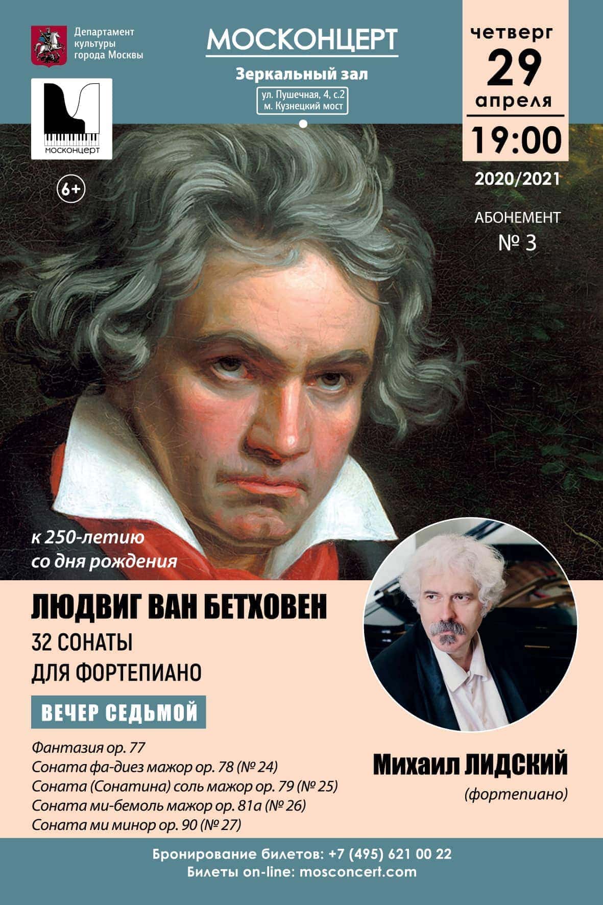 29 апреля в зале «Москонцерт на Пушечной» состоится 7-ой вечер абонементного цикла Михаила Лидского, посвященного 32-м сонатам Бетховена (к 250-летию со дня рождения композитора).