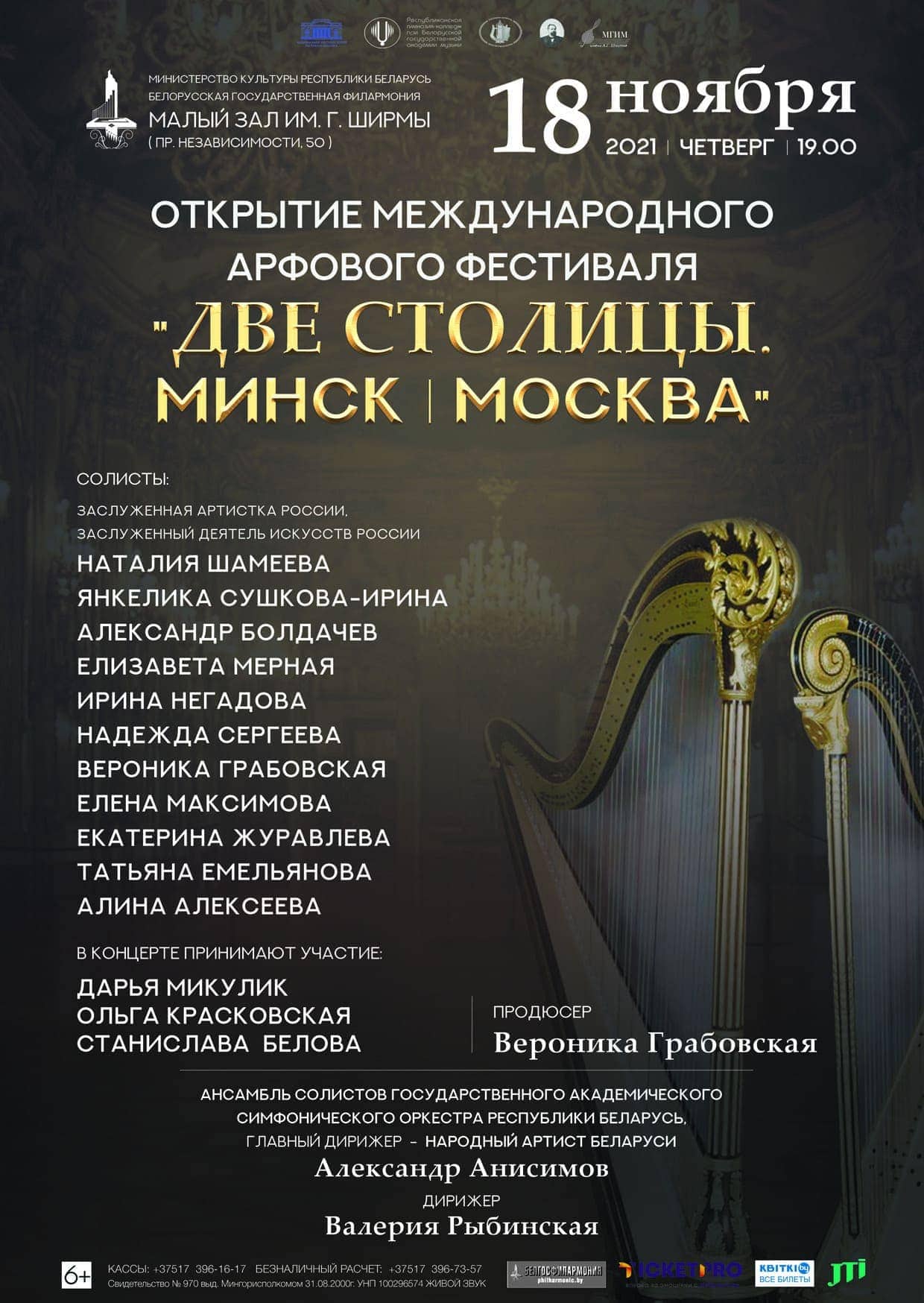 18 ноября 2021 года в Малом зале им. Г. Ширмы Белгосфилармонии состоится торжественное открытие международного арфового фестиваля «Две столицы. Минск — Москва».
