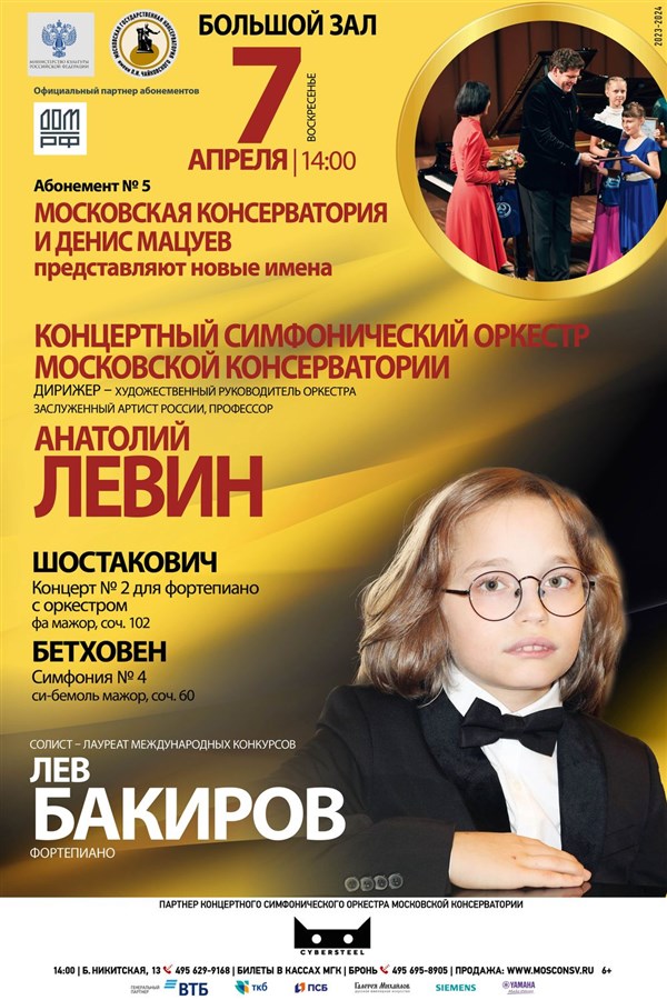 7 апреля 2024 года в Большом зале Московской консерватории выступит Концертный симфонический оркестр Московской консерватории под управлением Анатолия Левина и Лев Бакиров (фортепиано).