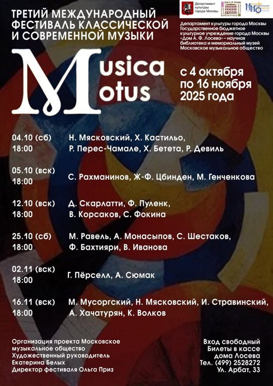 В октябре и ноябре 2025 года в центре Москвы на площадке Дома А. Ф. Лосева пройдёт фестиваль «Musica Motus». Он состоит из шести концертных программ, идеей выступает сопоставление классической и современной музыки.