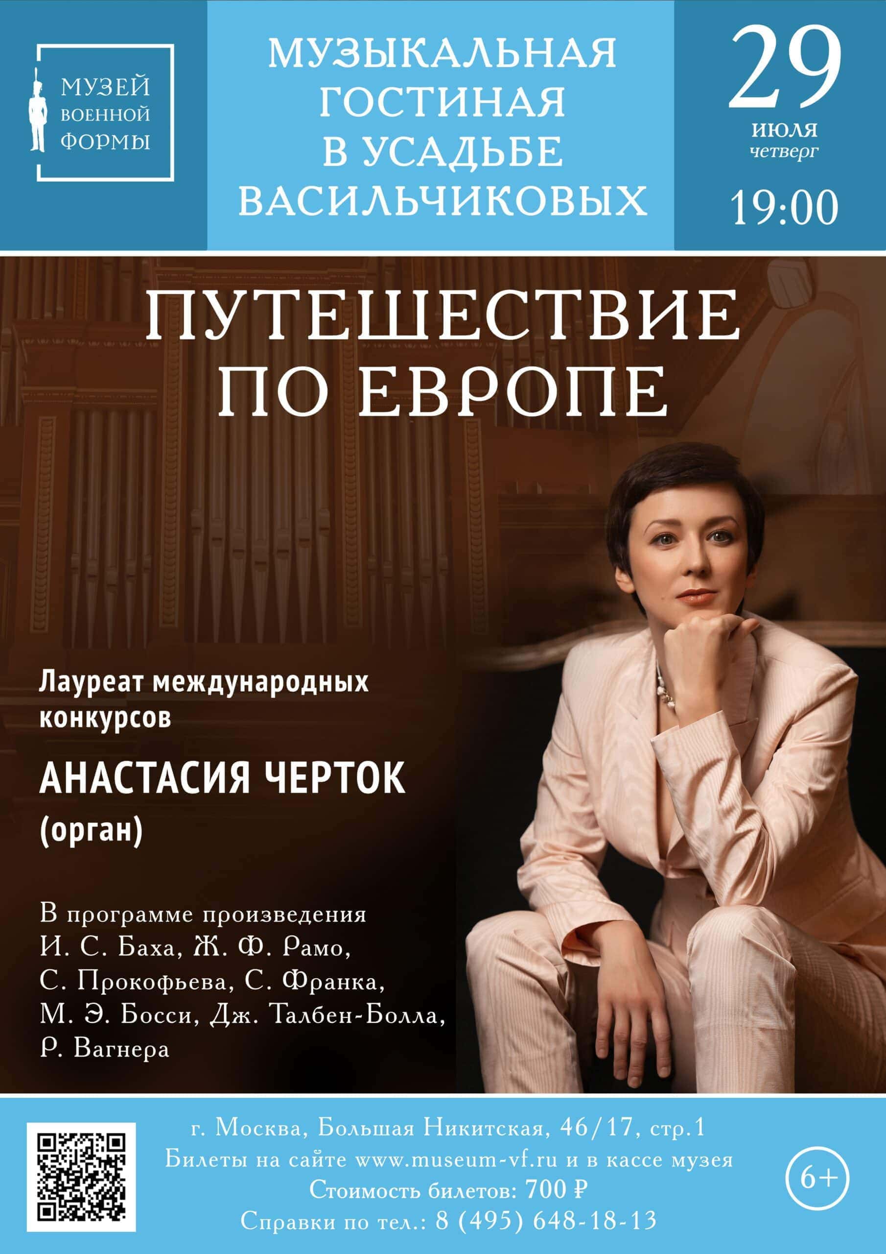 В четверг, 29 июля в 19:00, в Колонном зале усадьбы Васильчиковых (Музей военной формы) состоится первый органный концерт «Путешествие по Европе».