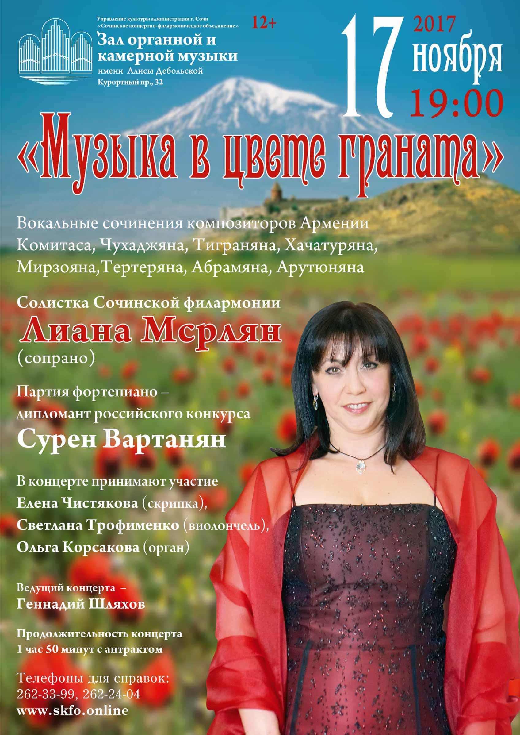 17 ноября 2017 года в сочинском Зале органной и камерной музыки имени Алисы Дебольской прозвучит «Музыка цвета граната».