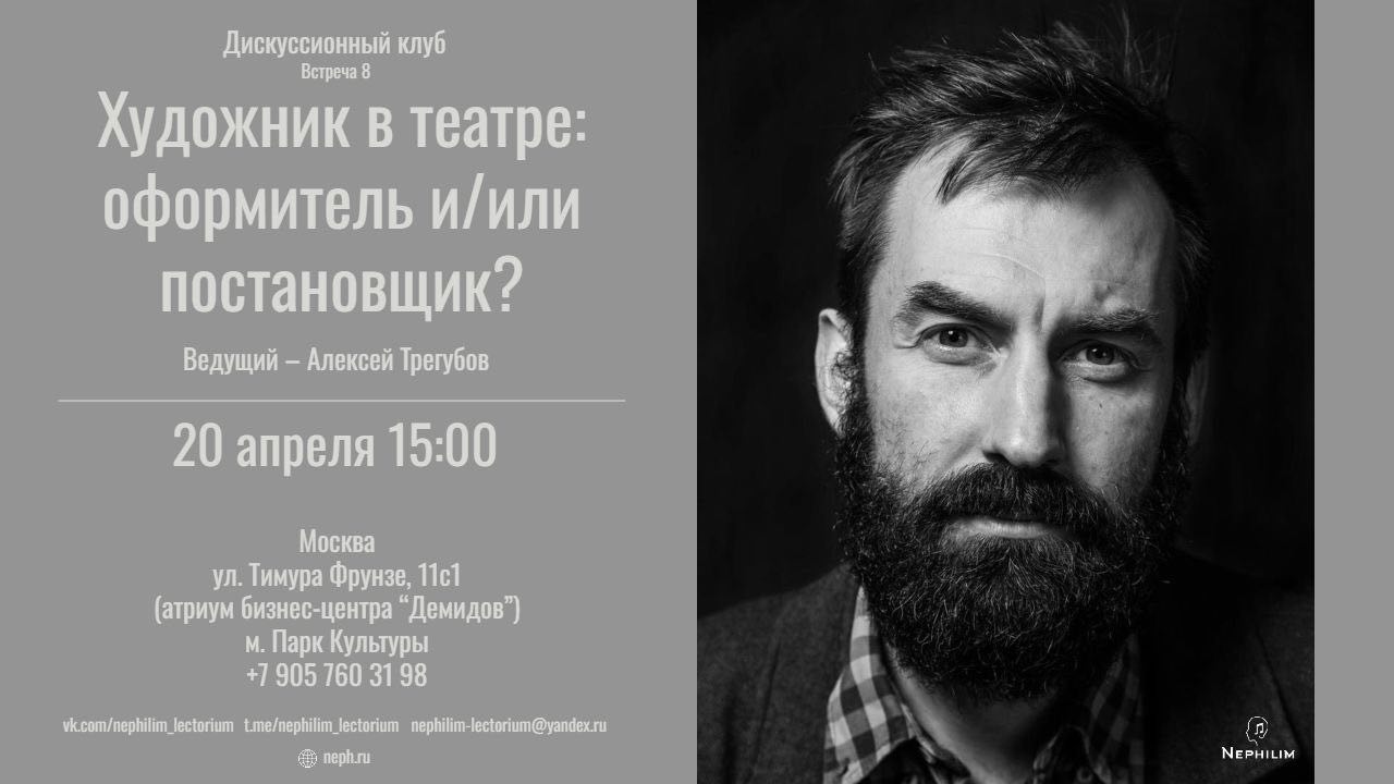 20 апреля 2024 состоится шестое заседание Дискуссионного клуба в рамках образовательного проекта “Нефилим”. В этот раз в качестве ведущего выступит театральный художник Алексей Трегубов.