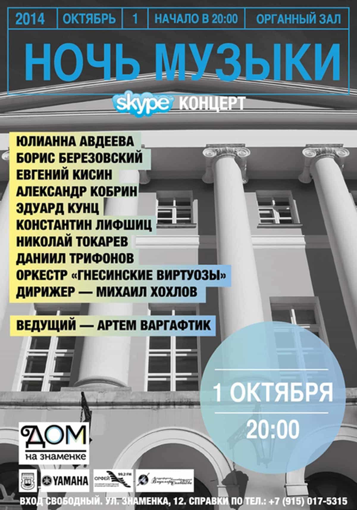 Открытие праздничной встречи пройдет в необычном формате «Skype-концерта». Знаменитые воспитанники «Гнесинки» – выдающиеся пианисты Борис Березовский, Евгений Кисин, Константин Лифшиц, Юлианна Авдеева, Александр Кобрин, Эдуард Кунц, Николай Токарев и Даниил Трифонов, находясь не только в Москве, но и в других городах мира, последовательно сыграют по одному произведению из цикла «Картинки с выставки» Модеста Мусоргского.
