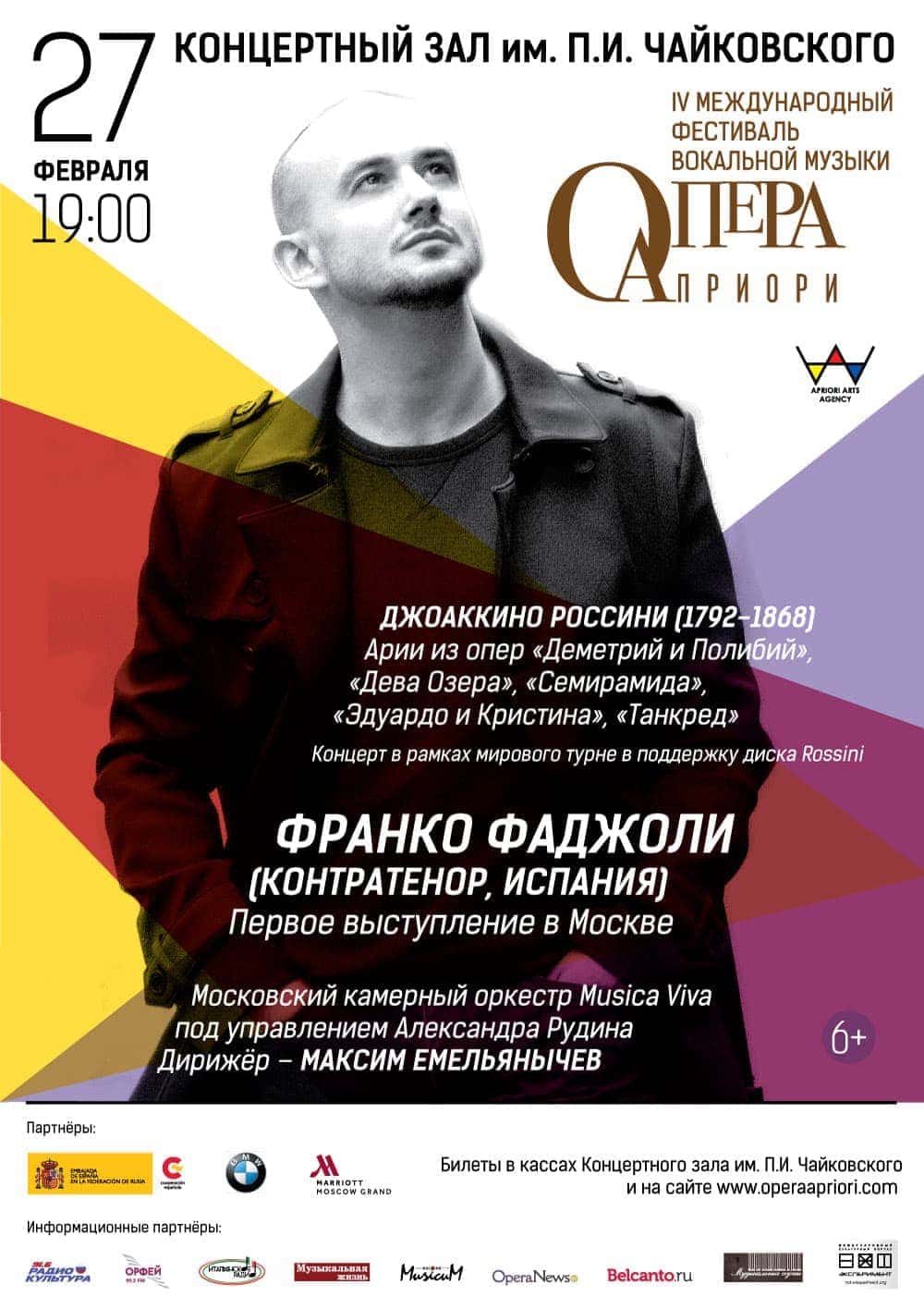 Московский концерт пройдёт в рамках мирового турне в поддержку альбома Rossini (релиз состоялся 30.09.2016 г.) одного из самых известных контратеноров в мире – Франко Фаджоли, для которого это выступление станет дебютом на московской сцене.