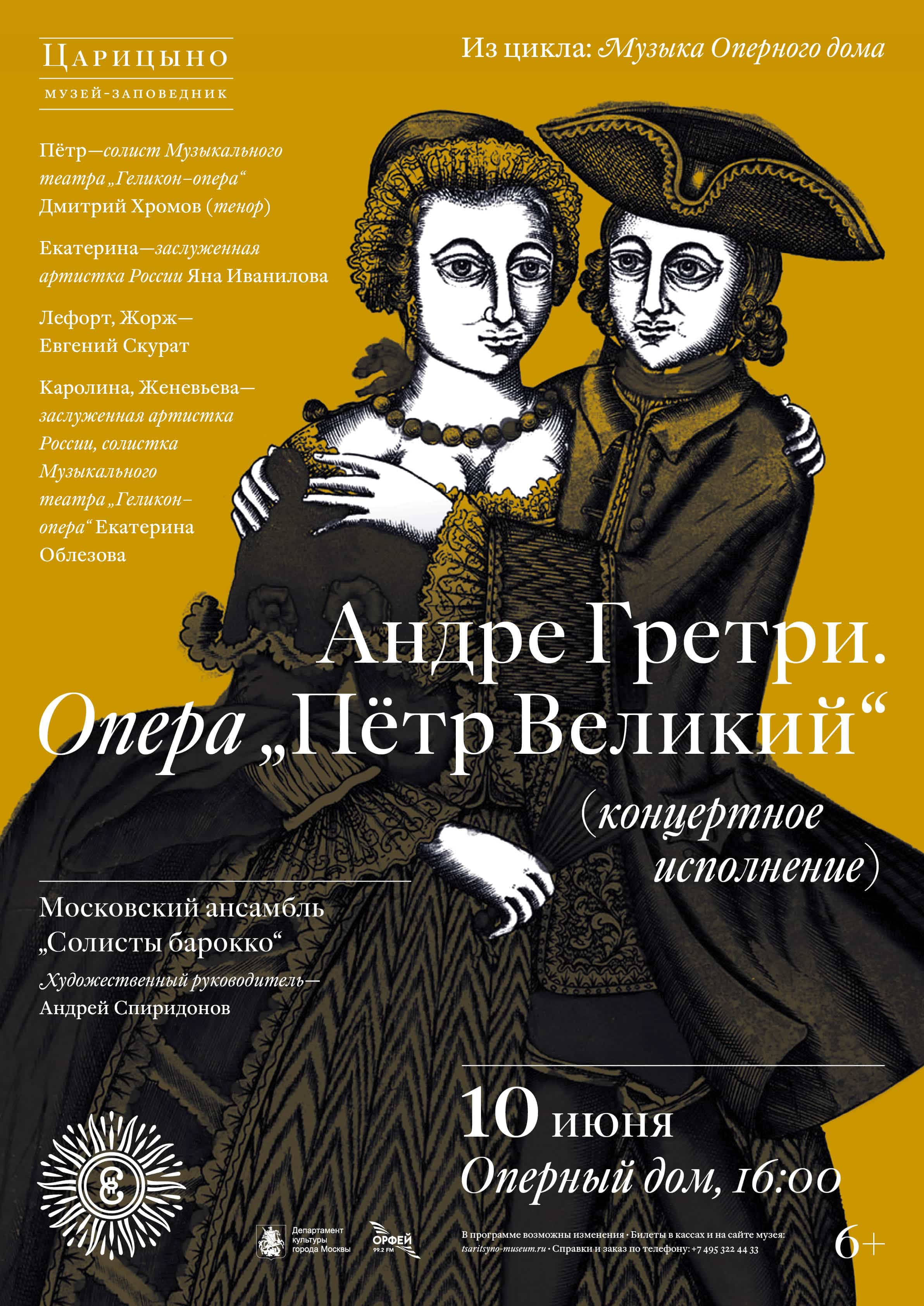 Редкая возможность побывать в Оперном доме (или Среднем дворце) музея-заповедника «Царицыно» на постановке оперы появится у слушателей 10 июня 2018 года – в 16:00 состоится концертное исполнение оперы Андре Гретри «Пётр Великий».