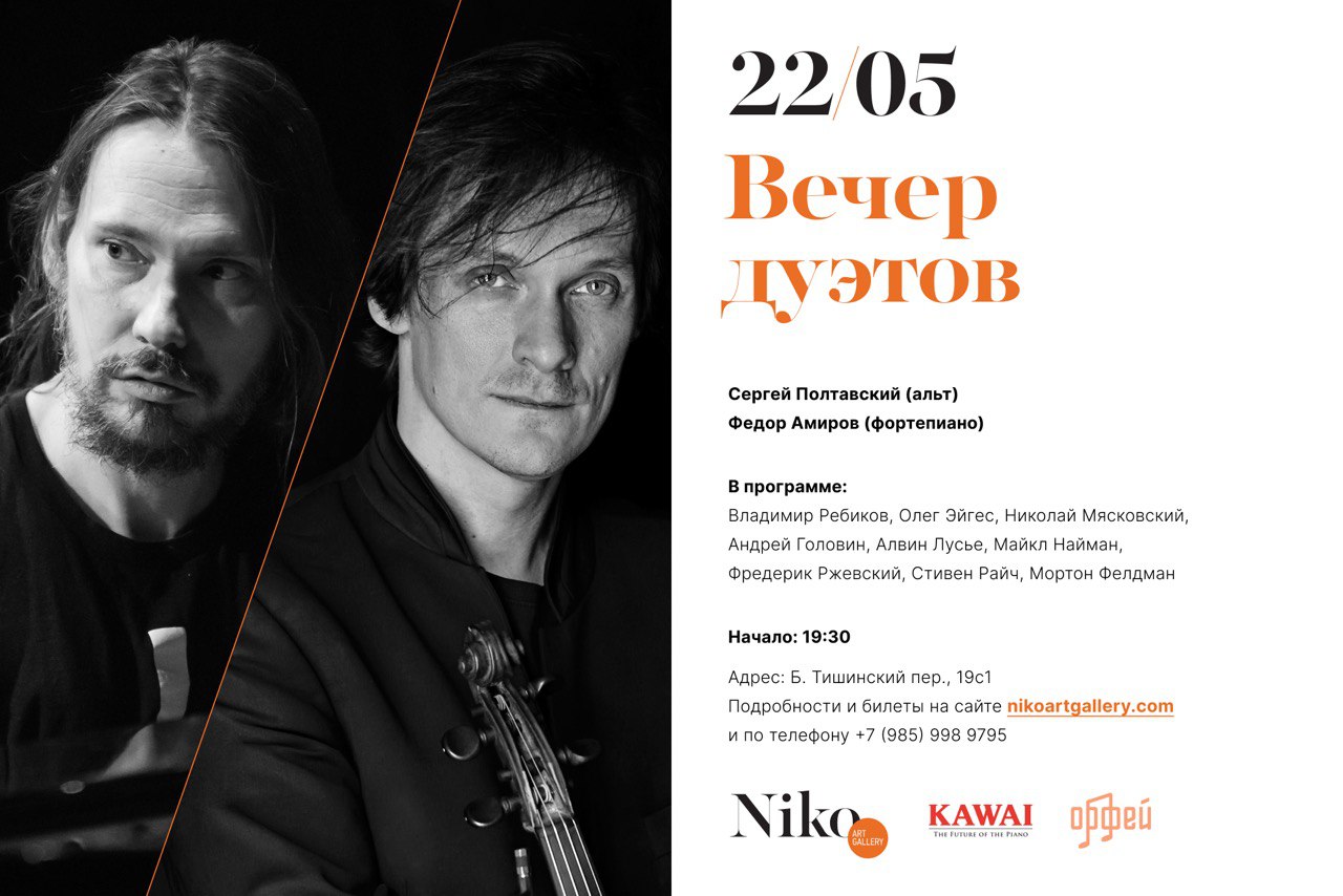 22 мая 2024 Сергей Полтавский (альт) и Федор Амиров (фортепиано) представят в галерее «Нико» программу, включающую произведения русских композиторов начала XX века — Ребикова, Мясковского и современных композиторов (Головина, Наймана, Райха и др.)