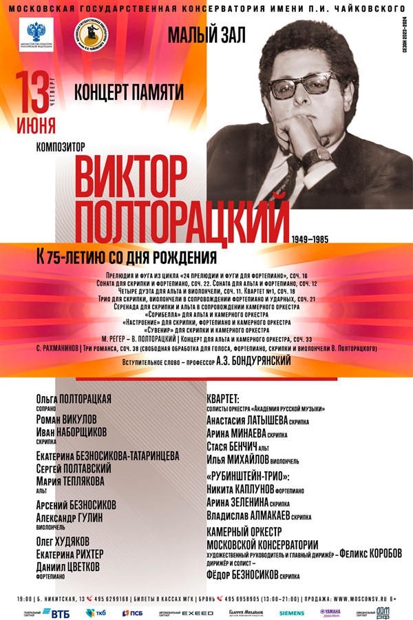 13 июня 2024 года в Малом зале консерватории пройдёт концерт в честь 75-летия со дня рождения композитора и пианиста Виктора Полторацкого (1949-1985).