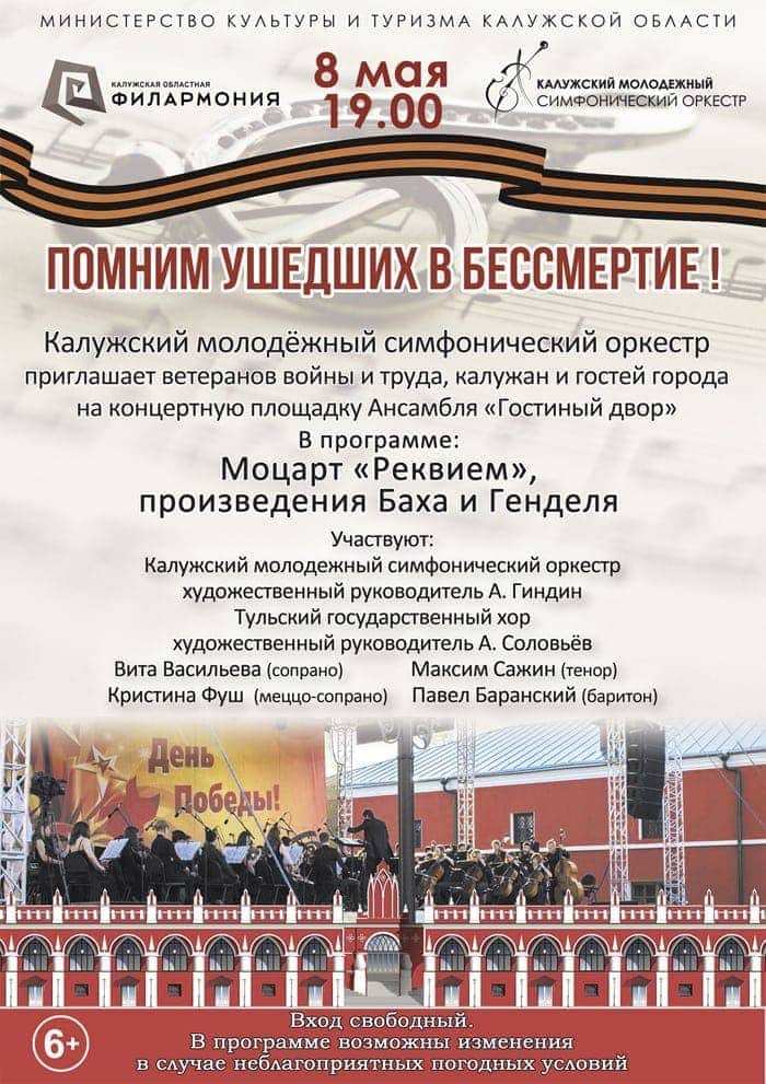 В канун Дня Победы, 8 мая, в Калуге, на концертной площадке «Гостиный двор», можно будет услышать величайшие произведения мирового музыкального искусства в исполнении Калужского молодежного симфонического оркестра и Тульского государственного хора, сообщают организаторы мероприятия.