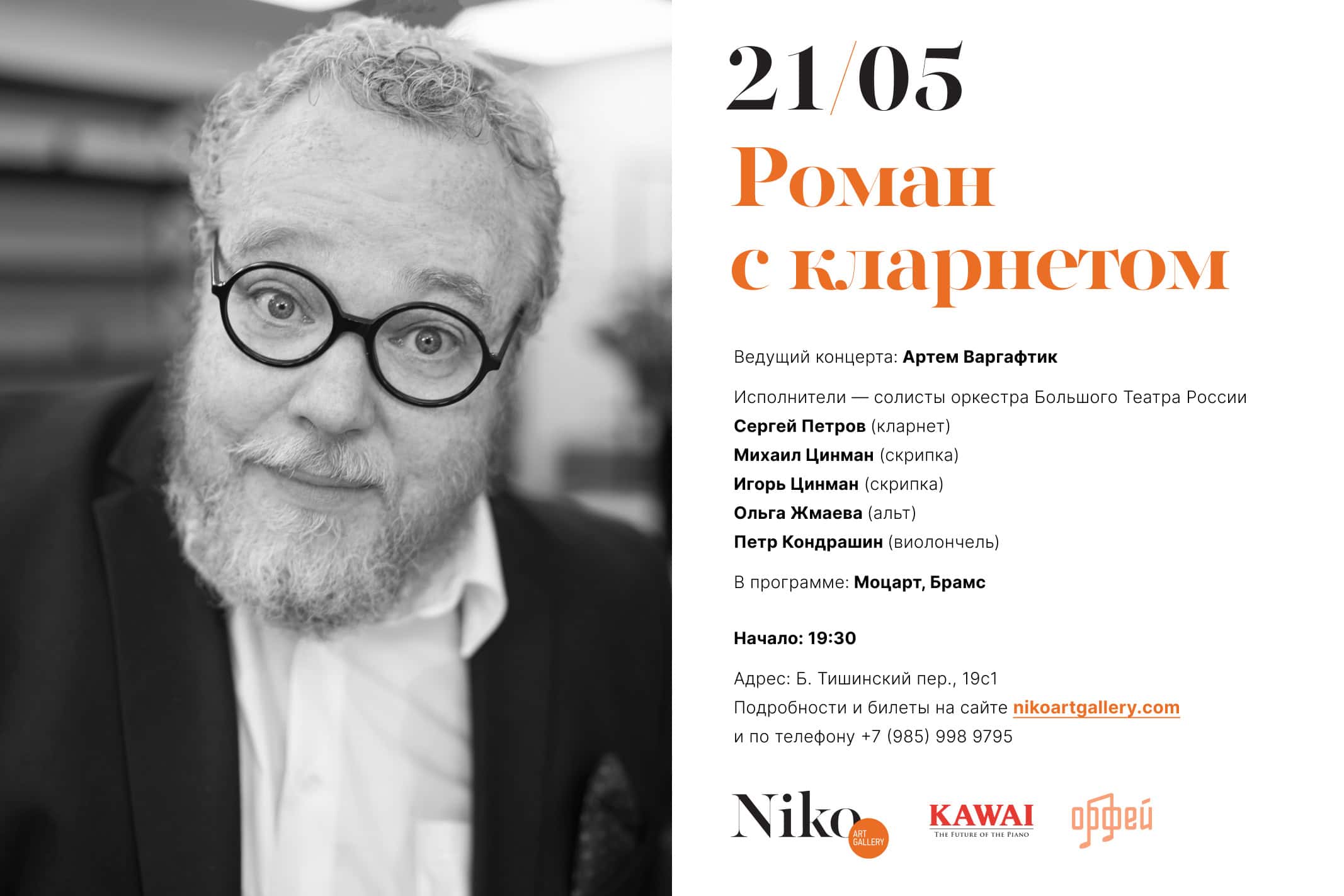 21 мая 2025 года в Галерее Нико состоится концерт рубрики «Артем Варгафтик представляет» с участием ведущих солистов оркестра Большого театра: заслуженного артиста России Сергея Петрова (кларнет), заслуженного артиста России Михаила Цинмана (скрипка), Игоря Цинмана (скрипка), Ольги Жмаевой (альт) и Петра Кондрашина (виолончель). Прозвучат кларнетовые квинтеты Брамса и Моцарта.