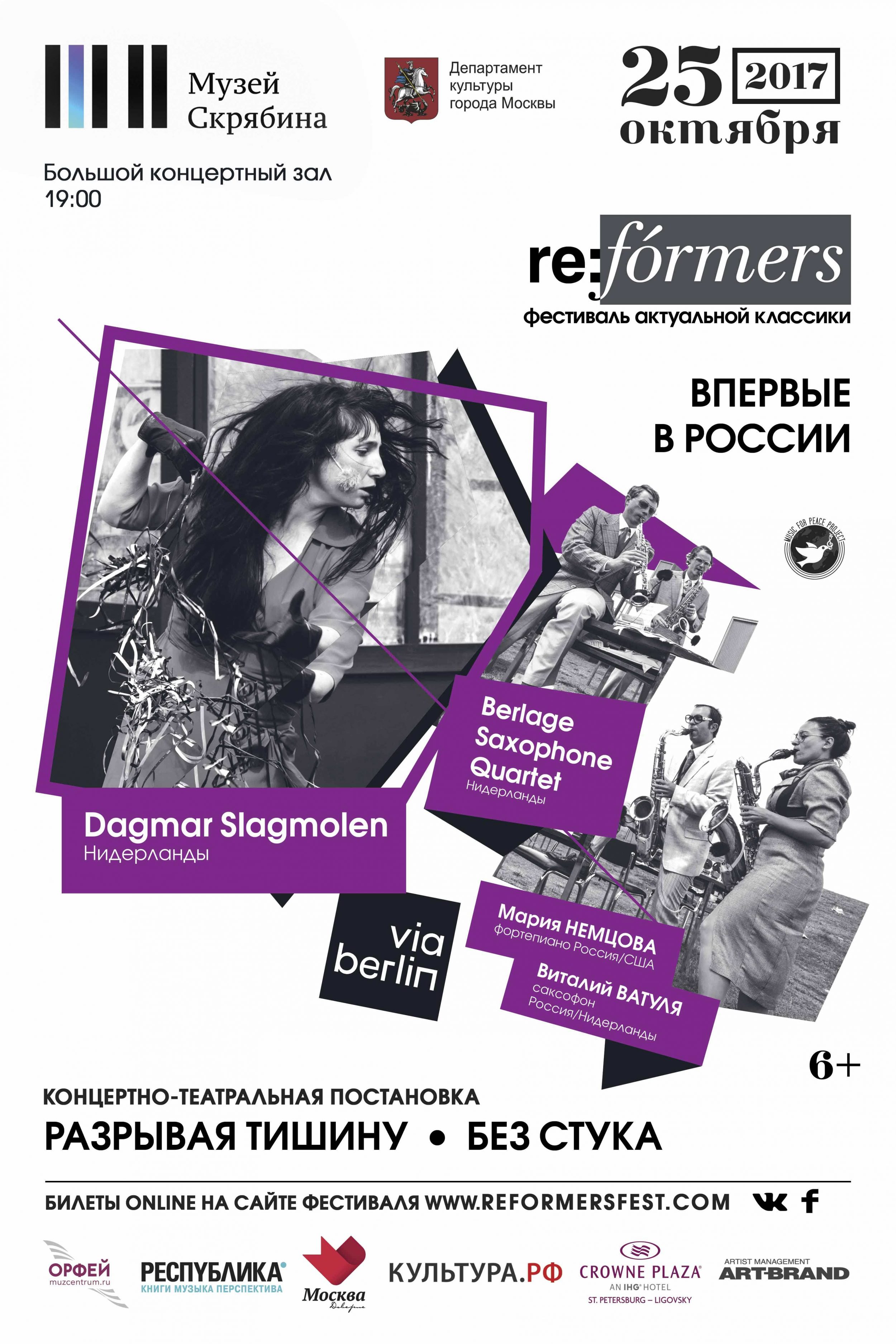 Второе отделение программы — нашумевшее в Европе концертно-театральное представление “Разрывая тишину” (Breaking the Silence), созданное проектом Via Berlin совместно с квартетом саксофонистов Berlage (Berlage Saxophone Quartet, Нидерланды).