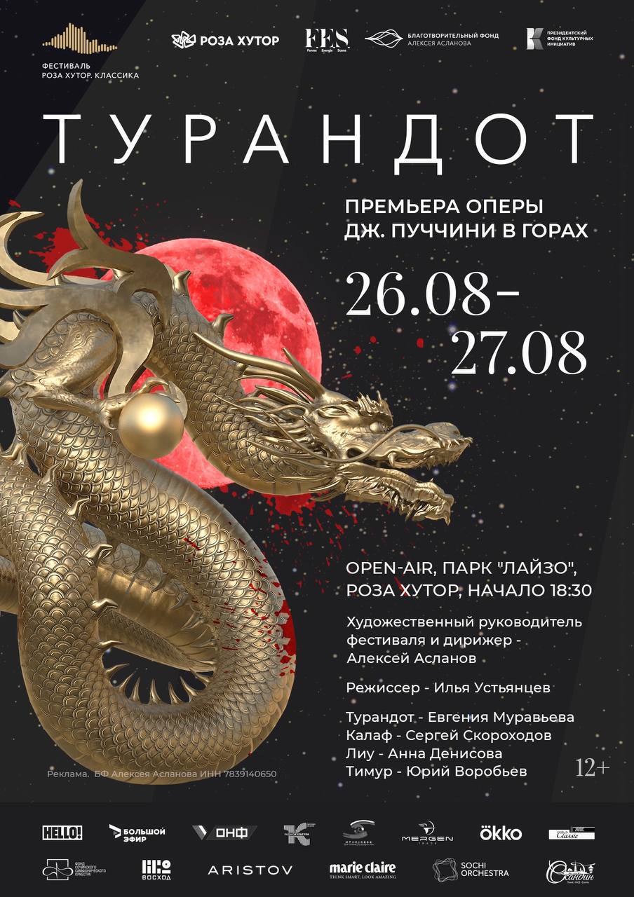 В заключительные дни фестиваля зрителей ждёт премьерная постановка оперы Джакомо Пуччини «Турандот» на открытой сцене парка «Лайзо», Роза Хутор. Солисты Мариинского театра с мировыми именами исполнят ведущие партии: