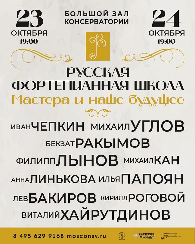 В октябре состоится первое выездное мероприятие проекта – концерт в Минске. Четыре ярких представителя «Русской Фортепианной Школы» — Мария Белокопытова, Тимофей Владимиров, Ева Геворгян и Валентин Малинин – исполнят шедевры русской и западноевропейской музыки на сцене Большого зала Белгосфилармонии. Кроме этого, запланирован концерт в Дубае.