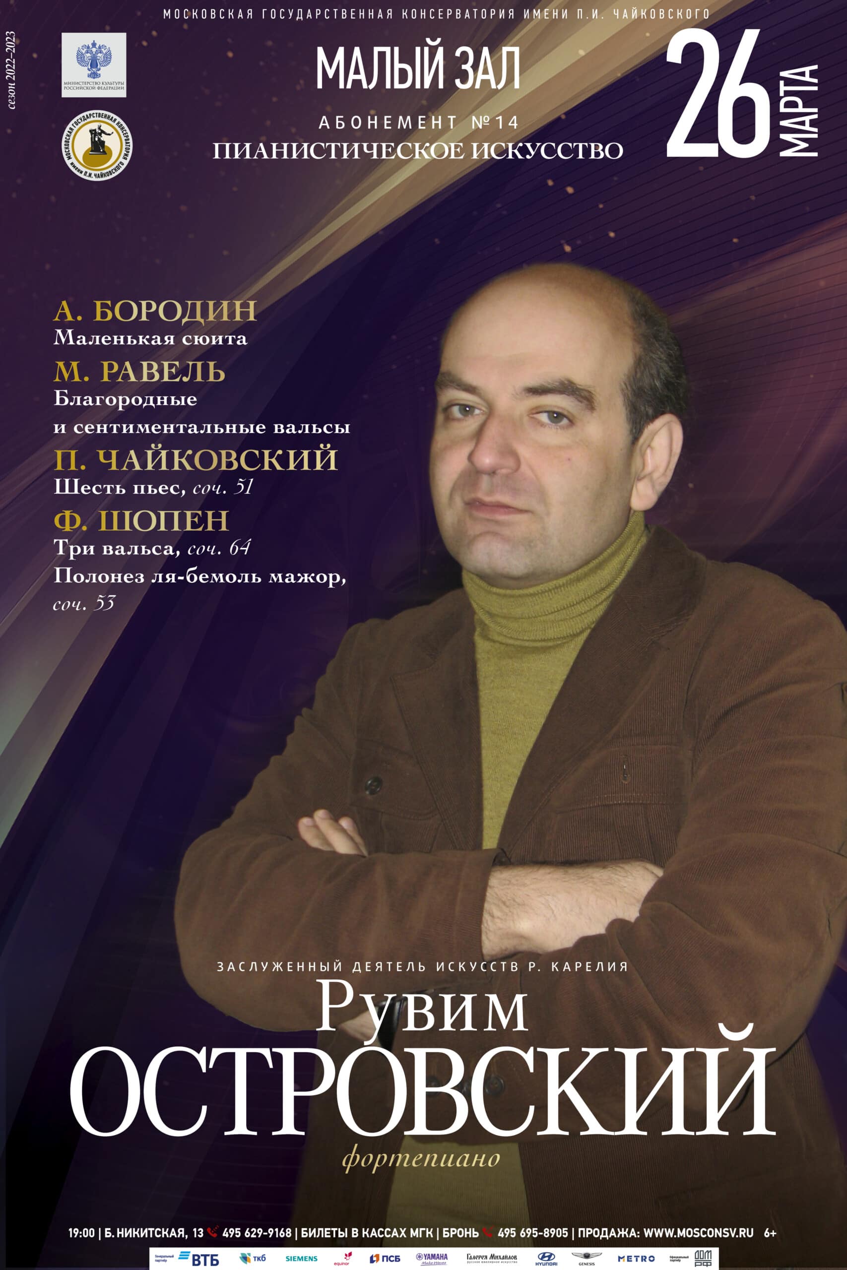 26 марта 2023 года в Малом зале Московской консерватории выступит пианист Рувим Островский. Он исполнит Вальсы и Полонезы Шопена, Благородные и сентиментальные вальсы Равеля, Маленькую сюиту Бородина и Шесть пьес Чайковского.