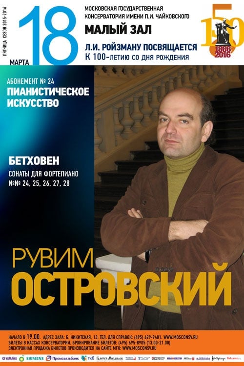 18 марта на сцене Малого зала Московской консерватории Островский исполнит Сонаты для фортепиано №24, №25, №26, №27 и №28.