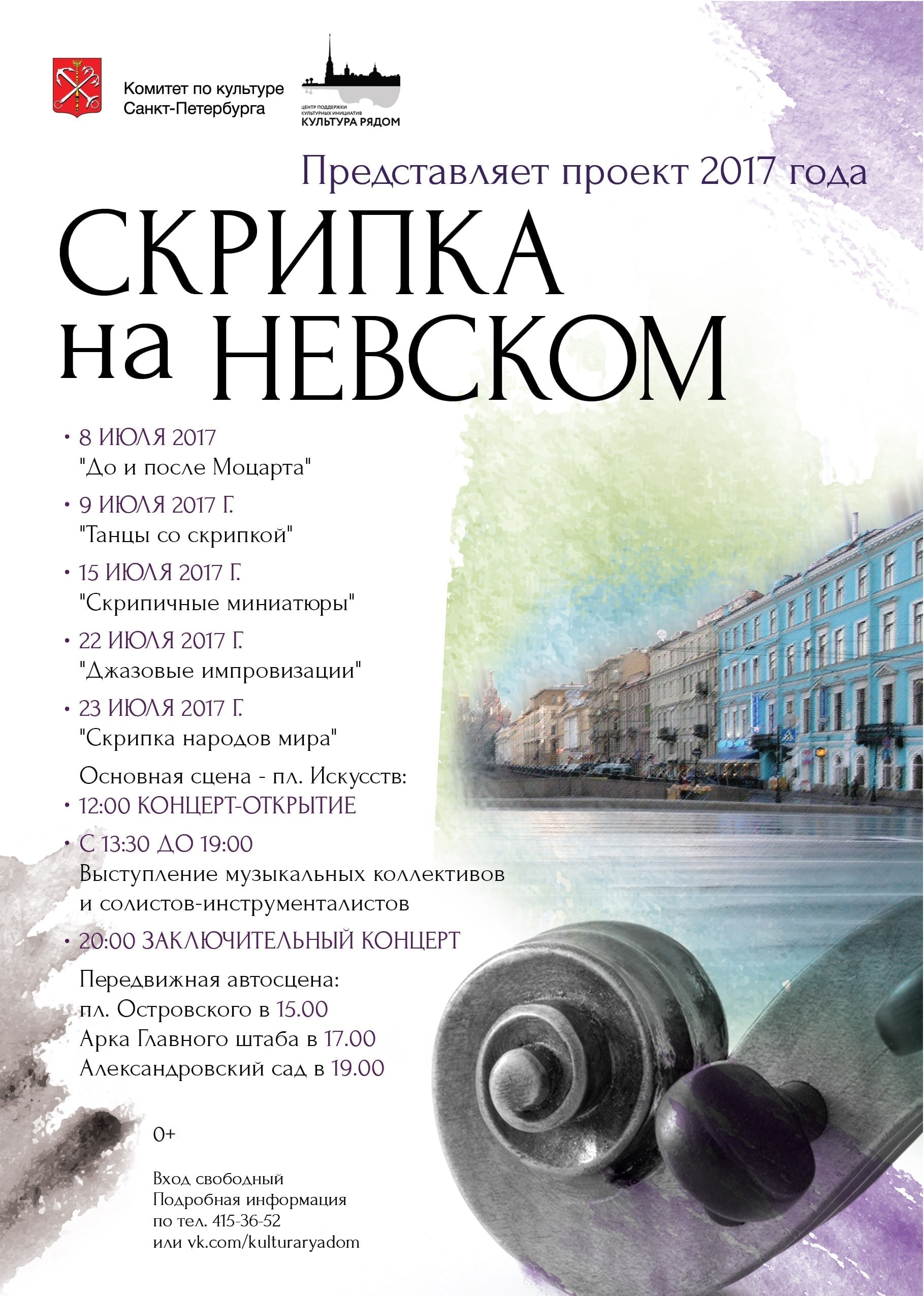 Центральным событием лета 2017 и географически, и концептуально уже третий год подряд станет проект «Скрипка на Невском», представляющий весь спектр богатства и колорита этого инструмента, объединяющего все музыкальные стили от народных, классических до джазовых и ультра-современных.