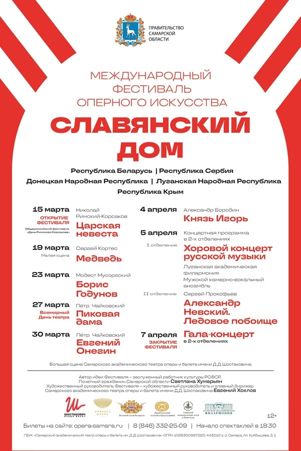 С 15 марта по 7 апреля 2024 года в Самарском академическом театре оперы и балета имени Д.Д. Шостаковича пройдет фестиваль оперного искусства «Славянский дом».
