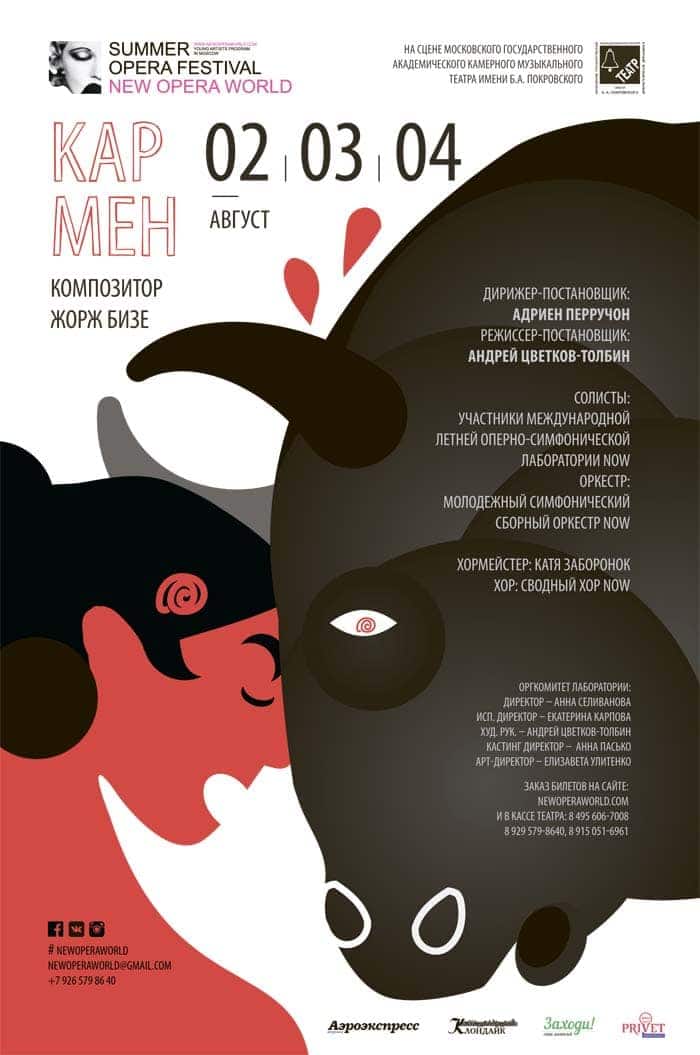 Со 2 по 11 августа в рамках фестиваля на сцене Камерного театра имени Б. Покровского состоятся премьеры «Кармен» Жоржа Бизе и «Царской невесты» Николая Римского-Корсакова. Спектакль «Кармен» представят в оригинальной постановке режиссера Оперного театра-студии РАМ имени Гнесиных Андрея Цветкова-Толбина под управлением дирижера Кельнской оперы, театра Елисейских Полей, Лос-Анджелесского филармонического оркестра, Люксембургского симфонического оркестра Адриена Перручона.