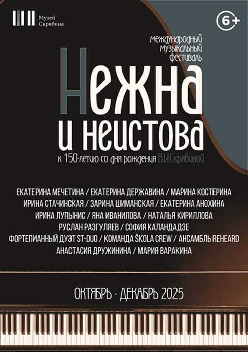 С 10 октября по 27 декабря 2025 в Музее Скрябина пройдет международный музыкальный фестиваль «Нежна и неистова», приуроченный к 150-летию со дня рождения первой супруги композитора – Веры Ивановны Скрябиной.