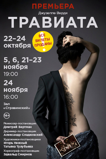 Четвертая постановка театра и восьмая Дмитрия Бертмана. Режиссер ставил ее в Германии, Канаде, Франции. От классических до эпатажных с куклами, монашками, ночными клубами. И снова Бертман оказался под обаянием скандальной Виолетты Валери. Спектакль сделал с Александром Сладковским. Его стихия — симфонический оркестр. Впервые со времен учебы дирижирует оперой.