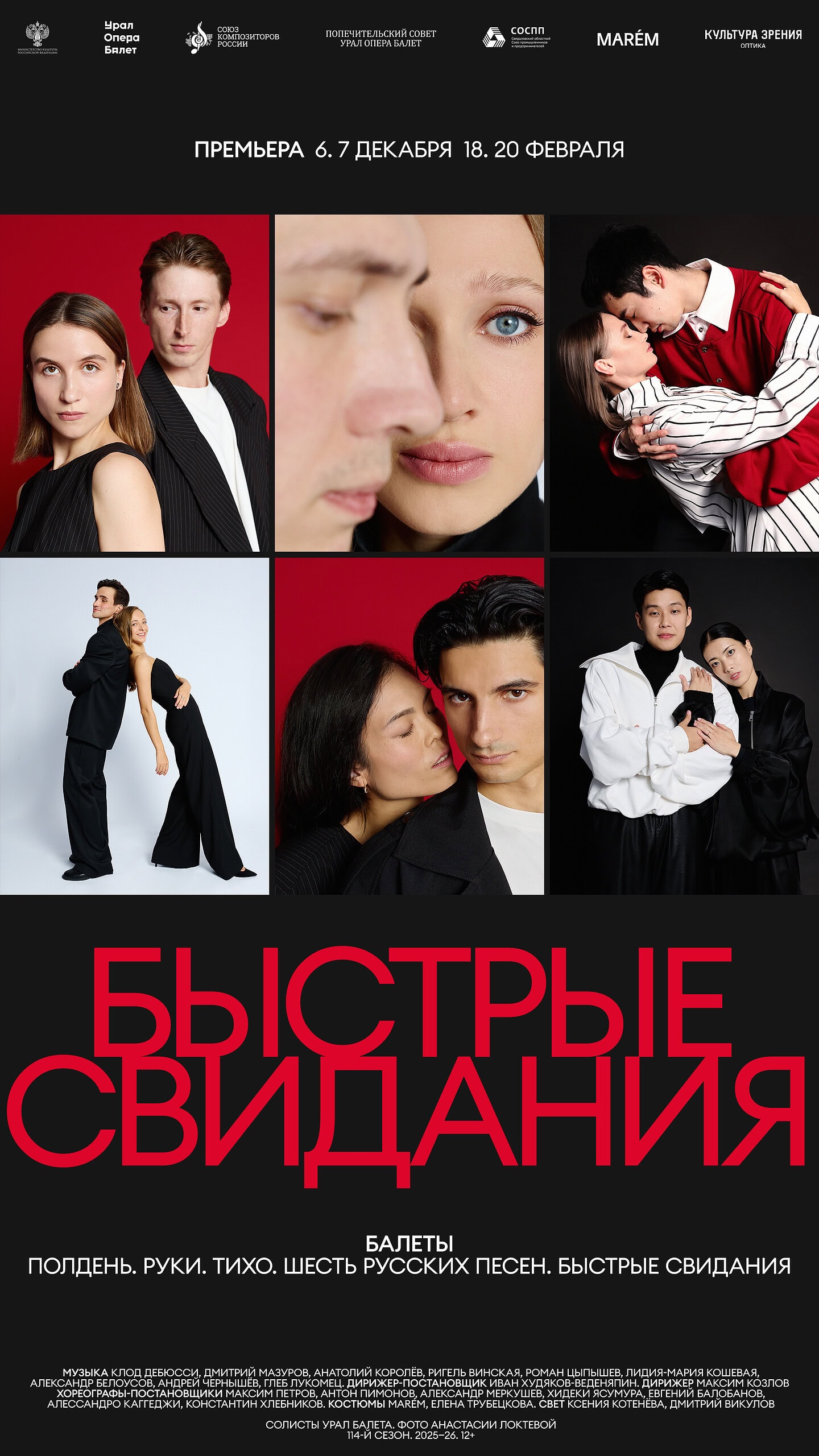 К ним присоединилась артель хореографов Урал Балета: Антон Пимонов, Евгений Балобанов, Алессандро Каггеджи, Александр Меркушев, Константин Хлебников, Хидеки Ясумура. Итог работы тринадцати соавторов – балет, который дал название всему вечеру, «Быстрые свидания».