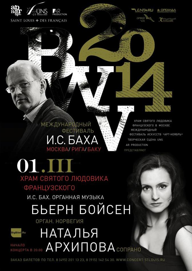 Открытие Первого фестиваля Баха состоится 1 марта 2014 года в Москве, в Храме Святого Людовика Французского, с участием выдающегося норвежского органиста, профессора Норвежской академии музыки Бьёрна Бойсена и лауреата Международного конкурса вокалистов в Ведене, певицы Натальи Архиповой.