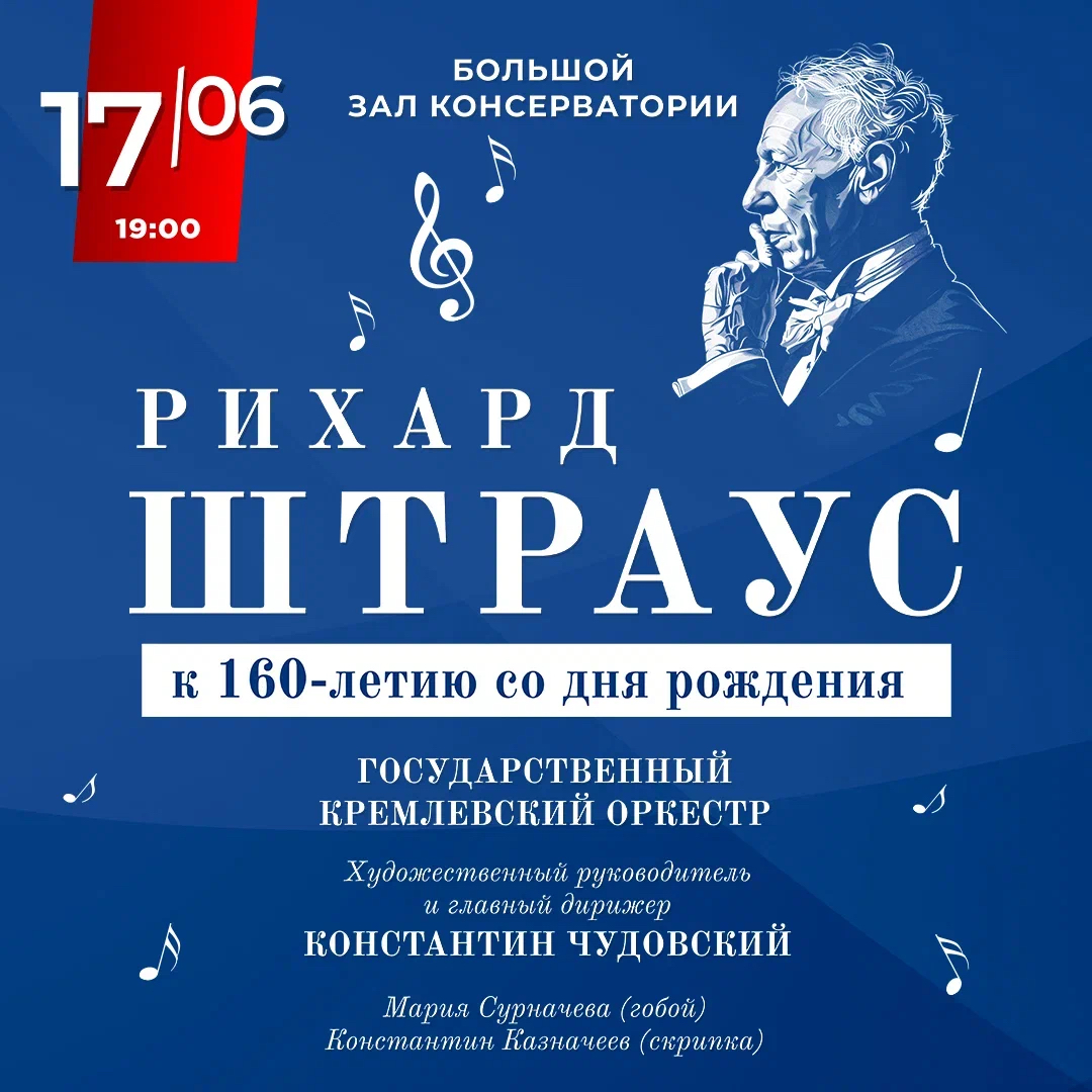 17 июня 2024 года в Большом зале Московской консерватории состоится праздничный концерт, посвященный 160-летию известного немецкого композитора Рихарда Штрауса.