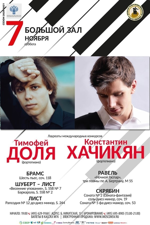 На сцену выйдут молодые пианисты, недавние выпускники Московской консерватории, которые сегодня с успехом покоряют музыкальный Олимп — Константин Хачикян и Тимофей Доля. Они являются воспитанниками заслуженного артиста России, профессора Андрея Писарева, ученики которого неоднократно становятся лауреатами международных конкурсов, востребованными артистами.