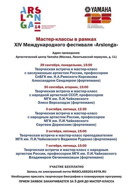 Участники фестиваля в этом году представляют Россию, Германию, Австралию, Сербию и Польшу. В рамках XIV Международного музыкального фестиваля ArsLonga будут проходить мастер-классы выдающихся представителей отечественной фортепианной школы: заслуженного артиста России Александра Сандлера; народной артистки СССР Элисо Вирсаладзе; народного артиста России Сергея Доренского, преподавателя МГК им. П. И. Чайковского Вадима Руденко; народного артиста России Владимира Овчинникова.