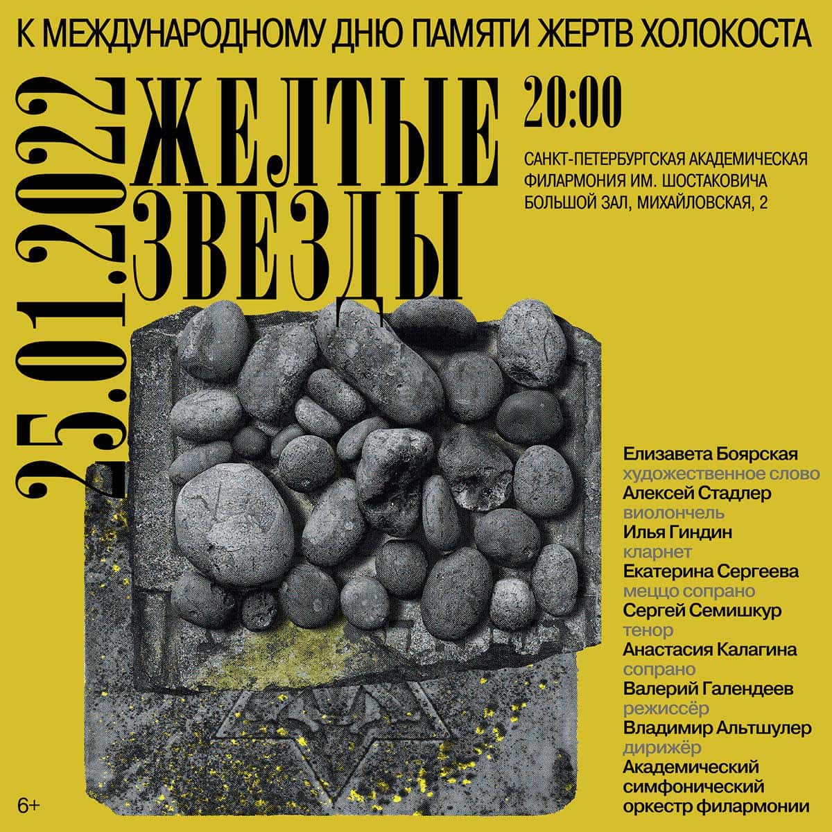 Уже седьмой год в Петербурге проходит проект «Желтые звезды» — этот концерт-посвящение приурочен к Международному дню памяти жертв Холокоста.