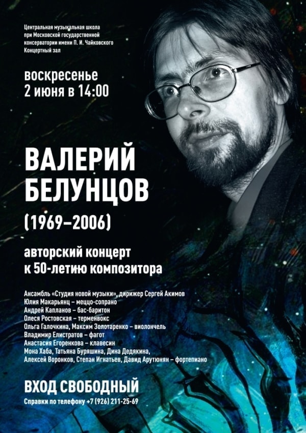 2 июня 2019 в Большом концертном зале ЦМШ состоится концерт, приуроченный к 50-летию со дня рождения композитора Валерия Белунцова.